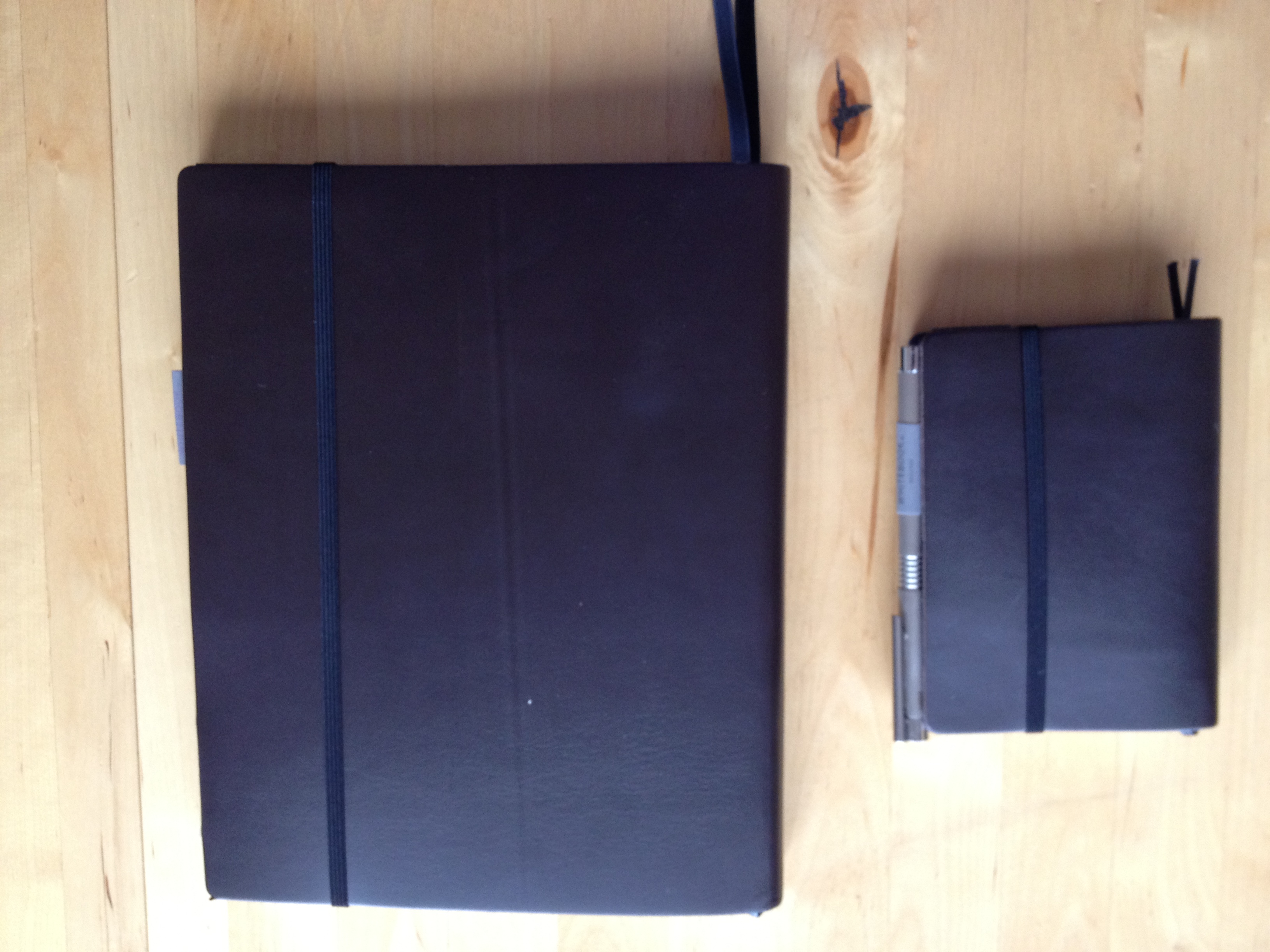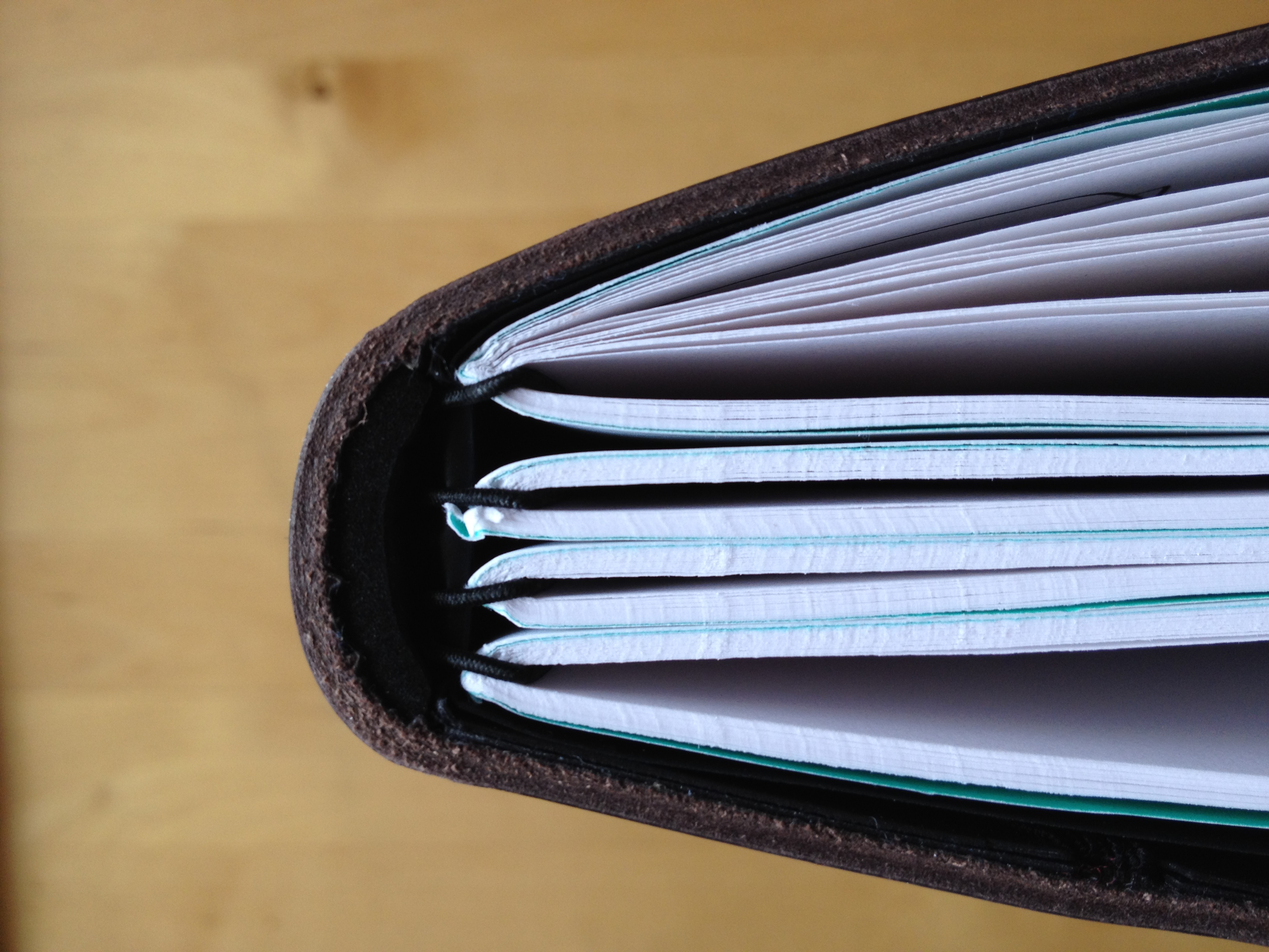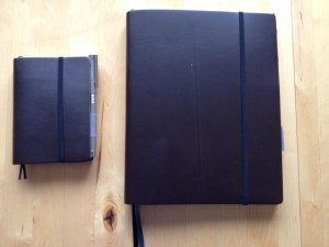 I think I’ve finally cracked the notebook situation. Since filling my MUJI B5 ringbinder notebooks a couple of years ago I’ve been struggling to find an alternative system. I posted previously about looking for another modular system which worked for me, settling in the end on A4 sheets and a folder as a way of working on multiple projects simultaneously. This was OK, but for some reason I like things to have a binding, which can be a problem if modularity is required. I didn’t really want to go down the ring binder/filofax route, so looked for some modular notebooks. There are a few systems on the market, like the German X17 which looked promising. This has a set of detachable notebooks which are held in a cover by elastic. I found some whilst in Basel last year, but the elastic didn’t really work for me, and its position on the outside of the spine looked like it would catch on things. I then discovered the Swiss Whitebook system, which is essentially identical, but with the elastic housed within the binding. The materials are good quality too, and they are ethically made. They aren’t cheap though! I decided to save up and buy a big and small version.