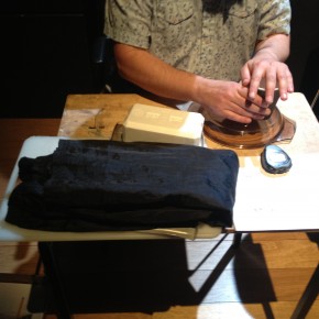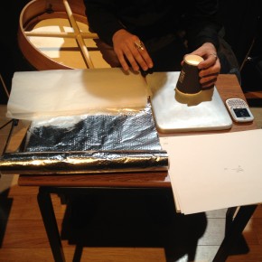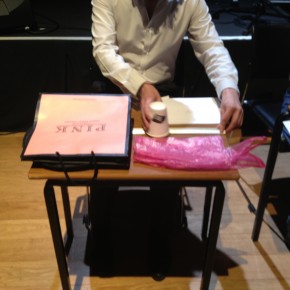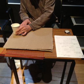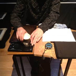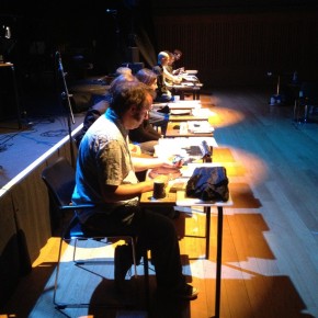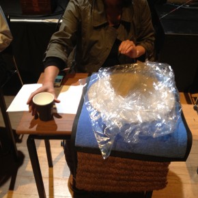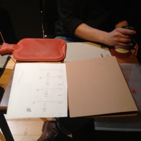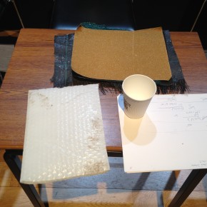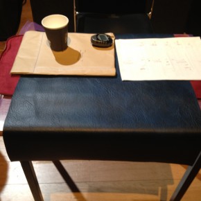 There was a repeat performance of the Audiograft event Lost and Found at Kings Place yesterday, organised by Paul Whitty. It featured performances by [rout], Kerry Yong, The Albion Players, and Parkinson Saunders. Tim and I played his four songs 2011, and [rout] played a couple of pieces from my series divisions that could be autonomous but that comprise the whole. Here are some photos of our rehearsal and the setup for my piece with coffee cups and surfaces, imperfections on the surface are occasionally apparent. Tim’s written five new songs which we’re going to begin working on in the autumn. They include electric guitars.