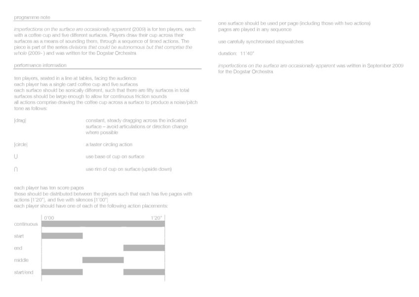 imperfections on the surface are occasionally apparent (2009) is for ten players, each with a coffee cup and five different surfaces. Players draw their cup across their surfaces as a means of sounding them, through a sequence of timed actions.The title is taken from Sol LeWitt’s text Wall Drawings (1970). The piece is part of the series divisions that could be autonomous but that comprise the whole (2009- ) and was written for Michael Pisaro. It was first performed by Experimental Music Workshop at the wulf, Los Angeles, 16 October 2009.